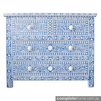 Enjoy the bold, decorative look and quality craftsmanship of the Tangier floral four-drawer chest from Zanui. RRP $2999. zanui.com.au