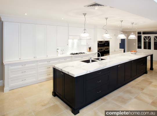 “This spectacular black and white kitchen cleverly incorporates all the practical needs of a family space without compromising visual appeal and charm. The heart of a bustling family home, the elongated space required extensive yet discreet pantry storage and a large work surface. Inspired, but not restricted, by the Hamptons style, we carefully selected each element to create a visual feast. The black island stretches impressively along the length of the kitchen, its striking Calacatta marble benchtop presenting a substantial work surface. The dark cabinetry expresses a sense of depth, contrasted against the backdrop of tall white cabinetry. Disappearing into the clean white surroundings, the Caesarstone bench in Pure White complements the tiled splashback, allowing the Calacatta island to be the hero. Extensive pantry storage and space for appliances are subtly integrated behind large bi-fold cupboards, while two refrigerators, flush-mount sinks and under-cabinet lighting focus on attention to detail and articulate design. The result is a charismatic family kitchen awarding every opportunity to cook, entertain and delight.”