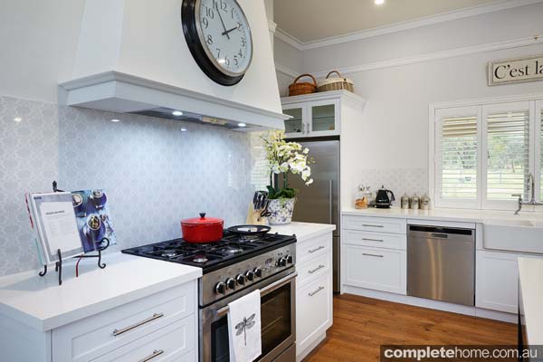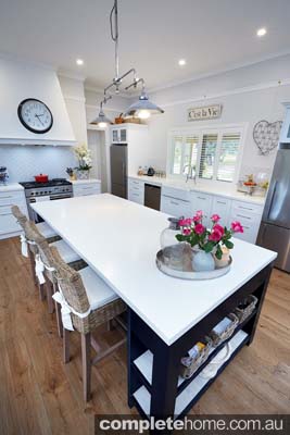 “As you walk up the long driveway, you are met by beautiful gardens filled with roses. The kitchen was the first stage of the home’s renovation. We enlarged the room by extending the exterior wall onto the verandah to the edge of the roofline. The island needed to be large for the family to gather around. Shaker-style doors provide a classic style that won’t date. The client wanted something different as a feature of the kitchen and, hence, the black island bench with chrome cup handles gives that sense of ‘wow’. The framing of the drawers and the detail of the legs make it a stunning piece of furniture. The custom rangehood enclosure is another feature, with the clock being a nice finishing touch. Finally, the polytec Ravine surface adds warmth to the overall appearance. The kitchen always had a really homely feeling and, along with carefully chosen pieces in the perfect places, the renovation has lifted and modernised the room.”