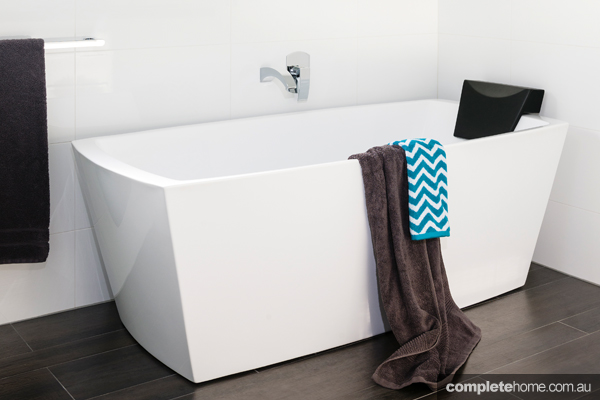 This contemporary bathroom screams luxury, with bounteous space, curves and elegant fittings.