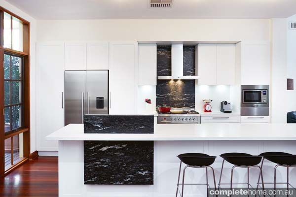“This kitchen is the result of careful planning and an extensive renovation of a 1930s home. We relocated the kitchen to the rear of the house, where it now sits within a larger space with convenient access to both indoor and outdoor living areas. Traditional Shaker-style doors and drawers are combined with stainless-steel handles that have a semi-industrial look inspired by new stainless-steel appliances. It’s a successful fusion of contemporary and traditional design that includes a custom-made stainless-steel drawer below the microwave designed to align with the adjacent 40mm stone bench. At the splashback, the black brushed granite creates a striking contrast with the surrounding white Caesarstone splashback and white joinery. We balanced the black splashback with a matching 100mm black granite box with mitred corners, which is located to conceal the sink. Stepped corbels below the 4m island bench take their design cues from Art Deco details in the home.”
