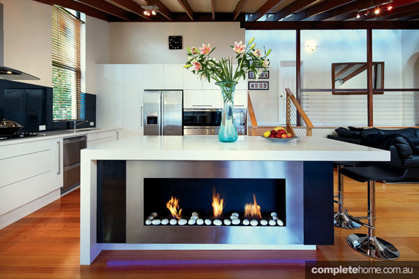 “The open-plan kitchen design brings the outdoors in with this home’s surrounding wilderness, accentuating the glossy whites and contrasting the chocolate beams on the ceiling. The angled roof adds height and dimension, complementing the home’s split-level design. Abundant storage space is evident with the spread of impressive overhead cabinets, deep drawers and a grand pantry. The generous, uniquely-cut island doubles as a breakfast bar and accommodates informal entertaining. The prominent gas fire feature illuminates the kitchen and creates a welcoming feel. Seamless flow throughout the kitchen’s working space is distinct, with easy access to the home’s living areas. The verdict: for the refined and recherché.”