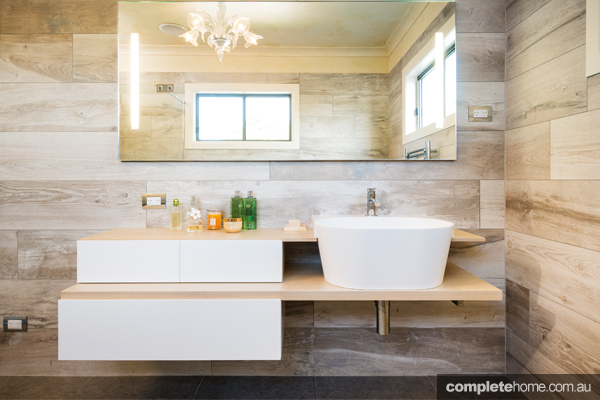 “This bathroom combines a distinctly European look and feel with the luxe quality of Italian fittings. Designed as a family space, it exudes both practicality and style. The luxurious porcelain tile floor flows upwards to the timber-look tiles, which set the tone for the room. The tiles are highly practical and water resistant, with a large format and horizontal grain to visually expand the space. The seamless shower base, together with the simple design of the toilet and bidet, further enhance this sleek, sophisticated look. The floating vanity takes centre stage with its generous timber top and striking white drawers providing ample storage. The back-illuminated mirror is an innovative twist, shining light where it’s needed most. The Venetian glass chandelier is the final touch of sophistication to complete this design.”