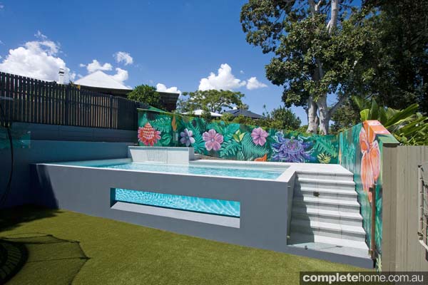 Easy accessibility is created with a paved entrance to the right of the pool and a glass fence ensures an unobscured view. A painted floral back wall ties the design together perfectly as it adds colour and art into the landscape without the hassle of gardening.