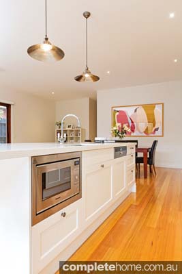 “These clients were having a new extension built that required a kitchen that would suit their bungalow-style home but be a real showpiece like a classic piece of furniture. However, it would need to be practical and efficient. It should also have good balance and symmetry but enough detail to create some movement in the design. A Hamptons-style theme was suggested with design flow created with the use of high open display units, colonial glazed glass doors under overhead spice shelves, together with a feature timber shelf under the breakfast bar. The practical element came from lots of drawers, built-in rubbish/recycling bins, detergent racks and a cook’s pantry for oils and sauces, along with a large pantry.”