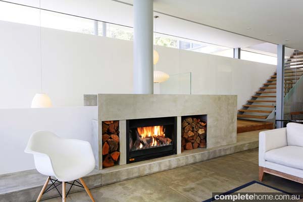 The ever-renowned Jetmaster Universal open wood fire, with its no-smoke design and two-way radiant and heating system, is featured here in an 850 Low model, designed by Saville Isaacs Architects.