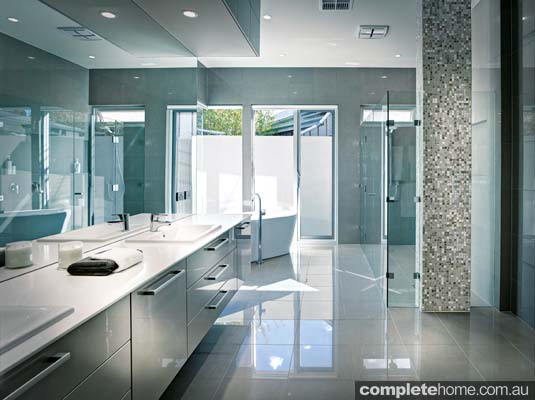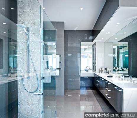 “The clients wanted a contemporary and spacious bathroom that was private but also provided views to the outdoor area. The position of the large free-standing bath tub creates a focal point, while the toilet is cleverly concealed for privacy. We were able to fit a double shower without compromising space by incorporating a feature mosaic nib wall to house the plumbing, surrounded by frameless glass. Large mirrors and gloss surfaces help reflect natural light, making this retreat bathroom feel even more spacious. While client satisfaction is the ultimate reward, it was great to also receive two awards for this design.”