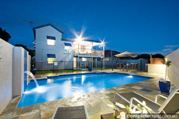 The pool water feature is wonderfully reminiscent of a waterfall. Beneath the sheer-descent water feature is a swim jet that enables the owners to swim kilometres worth of laps in the comfort of their own backyard. But not only is the design of this illustrious backyard resort reminiscent of nature’s finest, it is a magna pool with an eco pump to minimise its impact on the environment. With its formal and stylish design, the pool is sure to amaze even after sunset, when the dark-blue interior glimmers from the surrounding lights. There is no doubt that guests will favour the convenient and exquisite luxury of this pool over the crowded beach.
