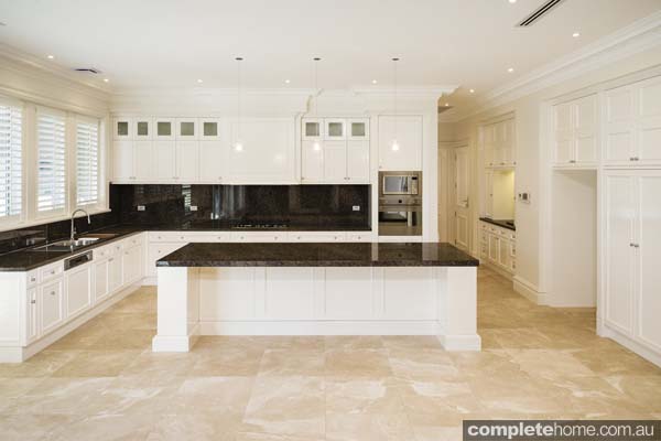“The clients wanted the kitchen to reflect the traditional style of the home yet with a simpler, more contemporary feel rather than an overly ornate style. It has elements of both French Provincial, such as the glass cabinets, and the Federation style of the cabinet profile and pillars. The custom-made kickboards, mouldings and canopy are other details integral to this traditional, yet timeless look. The colour scheme was kept neutral so the luxurious granite benchtops and marble floor would stand out. There’s great flow in the kitchen and plenty of storage as well as a full butler’s pantry, complete with another stove, fridge, dishwasher and more benchtop space for food preparation, leaving the island free for entertaining. The owners love their coffee so we included a separate side benchtop area to house their commercial-sized coffee machine. Everything has its place in this kitchen.”