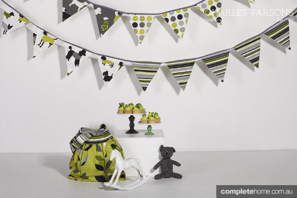 6. Pops of vibrant lime contrast refreshingly against muted khaki, soft grey and charcoal in this Free Range collection of fabrics. The playful designs, including polkadots and dogs, look wonderful made up as bunting or hangings in your child’s playroom.