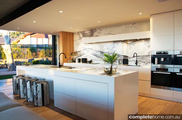 The placement of appliances — which include a wok burner — was important, and a longer-than-usual 4.1m island bench was given an interesting finish by using varying thicknesses of Corian for the top as well as shark nose detailing. The retro-modern look also comes across via the timber flooring, and extending this outside draws the eye to the view.